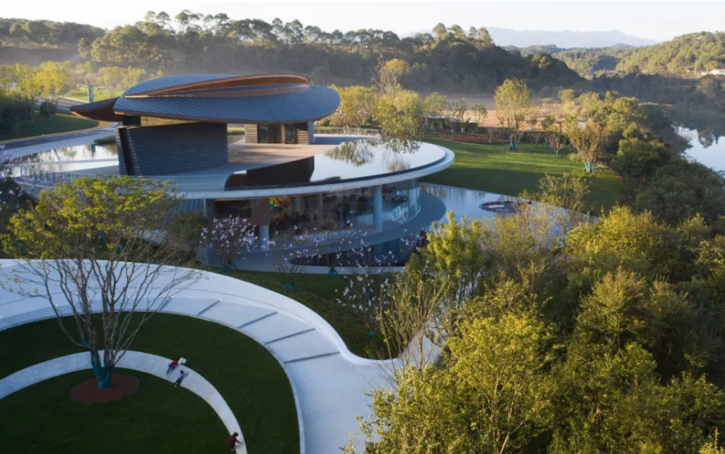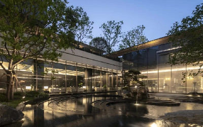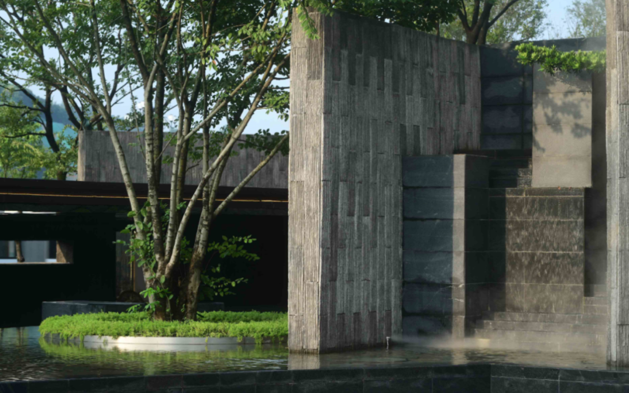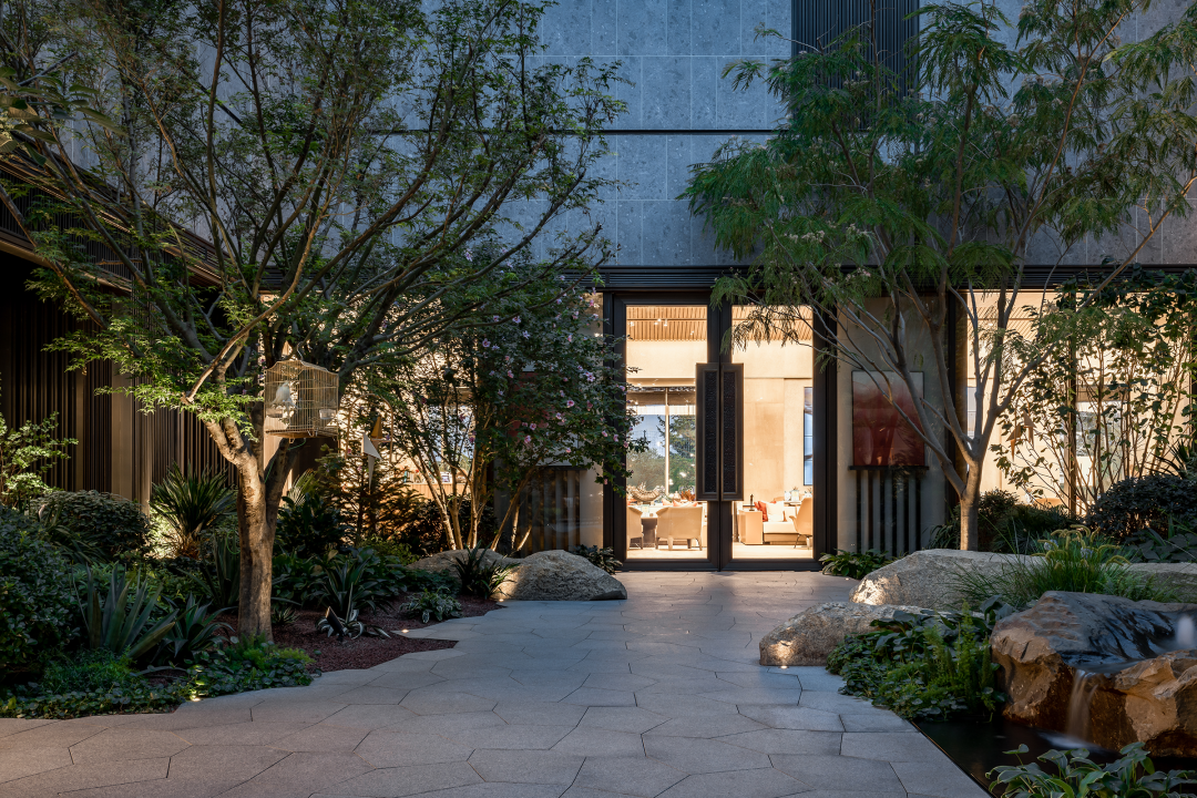 筑梦山水、绿野寻踪,绿野五章构筑森林秘境。穿越城市与场地边届,喧嚣在这一刻变得静止,穿过如同山壁一样的高墙,精致的屏风,仿佛进行了一场时空穿越。建筑如山岭在侧,景观如碧草芳林,相得益彰。向北转过空灵的对景,顺着悬廊勾勒出檐下的精彩,尽头处,一处清静的平台完成了森境的闭合,诗意的圆满。