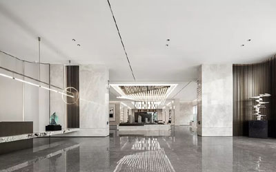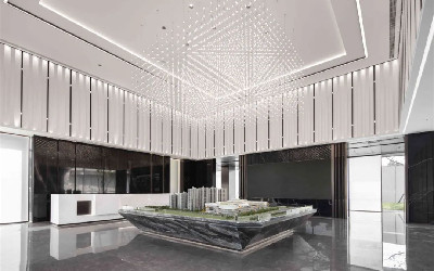 一贯坚持“纳自然之形,建空间之意”理念的 INNEST 意巢设计,担纲其营销中心的硬装设计。设计师对空间结构的艺术想象,建立在自然万象流动的诗意之上,亦与金陵折扇变幻的形制有关,均转译为当代极简的艺术表现形式。