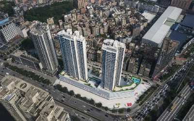 建筑采用了公建化立面的设计,有别于常见住宅裙楼底商分段式的设计,商业裙楼立面采用整体化设计,通过横线线条和优雅的弧线交织形成灵动柔美的商业裙楼立面,展现城市转角处自由流动的标志性形象,引领虎门年轻与时尚新风尚。