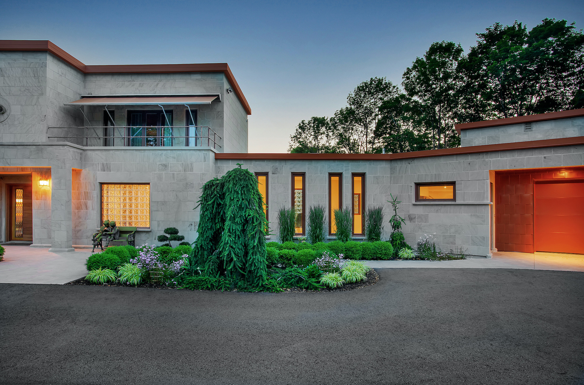 这座宽敞的住宅宛如一幅由玻璃与石材交织而成的美丽织锦,坐落于公园般的环境中,尽显优雅之姿,让人倍感亲切。