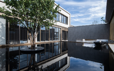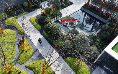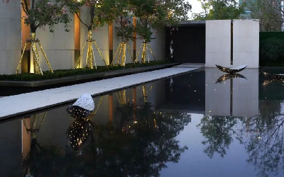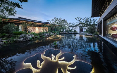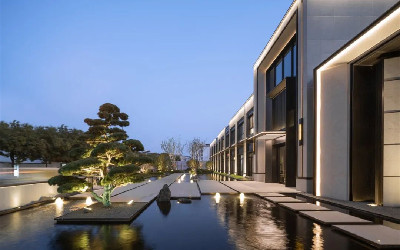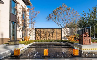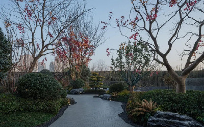 项目整体景观设计结合建筑布局及风格,平面布局设计去风格化,种植及构筑物融合新中式风格元素体现空间效果。