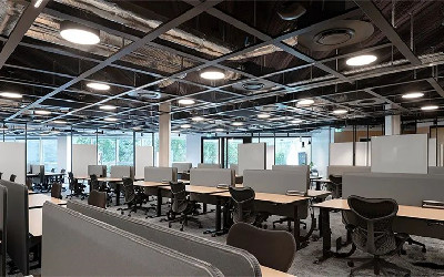 随着全球科技迅速发展,建于21世纪初的都柏林微软工程中心(以下简称“OMC”)已无法应对微软员工日益现代化、协作性强的办公需求。设计团队对这座已有近20年历史的办公楼进行了全面改造,尽可能多地将自然光引入室内,并通过中庭的一座开放式楼梯连接室内三层空间。每层的公用活动区、独立办公间、会议室等共享空间环绕中庭外缘排开,形同“脊柱”状,办公区则沿“脊柱”分支扩展开来。设计灵感来源于森林,中庭如同林间的一片空地,而悬挑在中庭最上方的会议室则犹如一座“瞭望塔”。