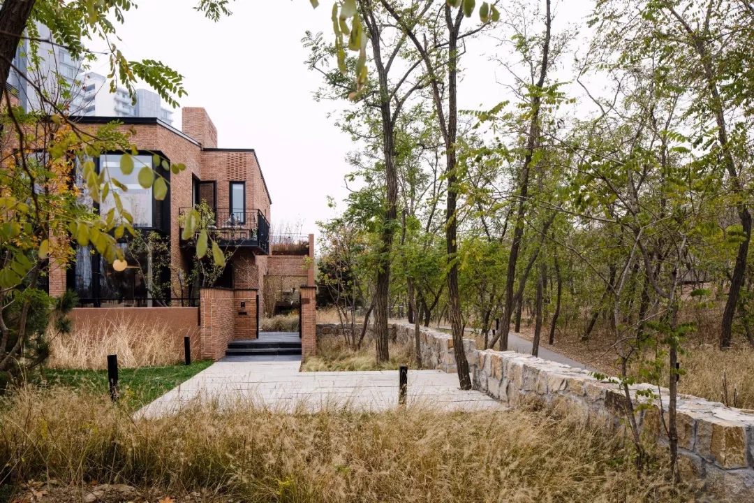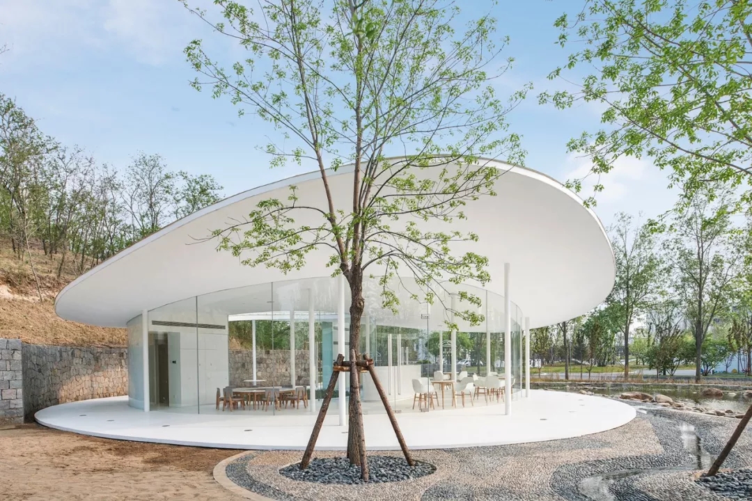 项目是以体验槐树林为主的餐饮建筑。场地边是一片海滨槐树林。首要考虑建筑与环境的关系,建筑师让建筑从三面去接触树林,再将体块分割成三个体量,体量间隙种植槐树,形成被树林三面围合的效果,最大化观景面,建筑与槐树林穿插交错,融合共生。三个体量由一条面向社区的交通空间连接,完成服务和流线功能。建筑面向槐树林的一侧全部使用玻璃幕墙,社区一侧使用透光混凝土墙面,外立面是整排木格栅,入口隐于其中,与周边树林浑然一体。高低错落的双坡屋顶,形式简约,双层屋檐的设计给建筑带来灵动轻盈感。