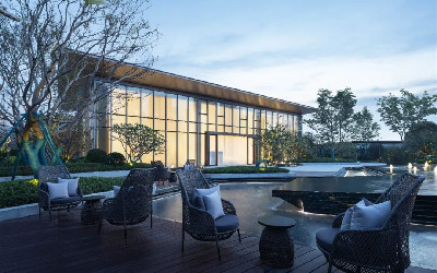 项目坐落成都简阳市,北临沱江,南邻鳌山森林公园,坐拥在山水之间的人文之地,流淌着自然文雅的气质,温和而从容。项目周边配套资源丰富优质,设计团队利用高差,打造风格独树一帜的城市景观界面,运用丰富的植物组团营造安静私密的空间,隔绝噪音,打造差异化景观。