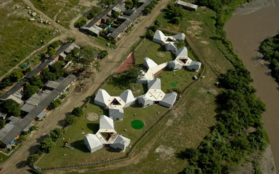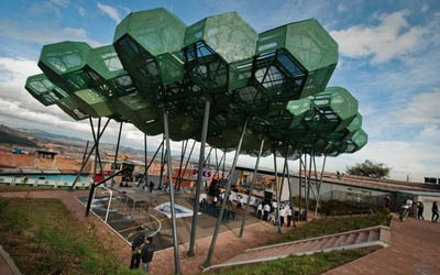 这些多面体泡泡装组成的绿色“浮云”是位于哥伦比亚altos de cazuca一处棚户区内的露天运动场和公共广场。每个“泡泡”是一个12面体,它们相互簇拥共生在一起,形成一面700平米的大屋顶,像一个大树冠为这片活动区提供阴凉并遮风挡雨,同时为这个区域增添了活力!