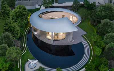 面对如此优越的自然环境条件,我们自然不想让建筑成为突兀的入侵者。如何使建筑消隐于山海之间,保障更通透的观景视野,是我们在设计中的目标与尝试。因此我们决定弱化地上的建筑部分,将主要功能置于地下空间。在地面仅保留电梯厅及作为视线引导的廊桥。由此从外而内,从上至下,最终引导到下沉庭院中,完成了整个空间形态的起承转合。