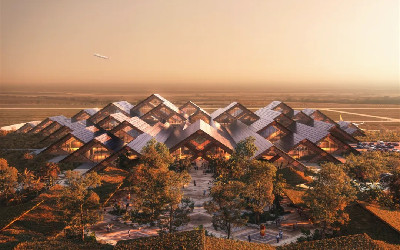 机场的设计以喜马拉雅山脉为背景,采用斜交网格架结构,并选用本地出产并可持续采购的木材,配以当地艺术家创作的传统不丹木雕为装饰。外立面的涂绘灵感来源于设计精良、富有深远结构意义的“不丹木柱(Kachen)”,彰显了不丹建筑的文化遗产和精神象征。
