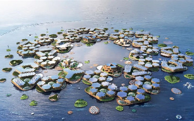 由BIG设计的漂浮城市釜山OCEANIX将占地75万平方米,由六个社区组成,分别承担公共广场,购物,教育,医疗,体育及文化等用途,可容纳约1万名居民。此方案由BIG建筑事务所与OCEANIX科技公司,麻省理工学院海洋工程中心共同提出,获得联合国人居署批准,预计于2025年在韩国釜山落成,以应对海平上上升给城市带来的威胁。