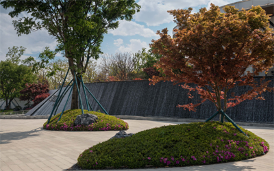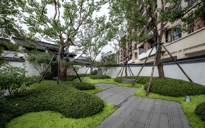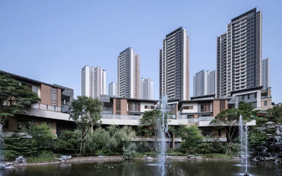 以“三进式”景观空间将整个动线串联, 入口广场(前场)——共享庭院(后场)——归家花园(样板房), 层层递进,为到访者营造移步易景的沉浸式体验。 主入口处是尊贵大气的迎宾景观区, 用“特色水景”“特色铺装”“特色种植”三大主要元素构成。