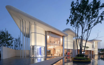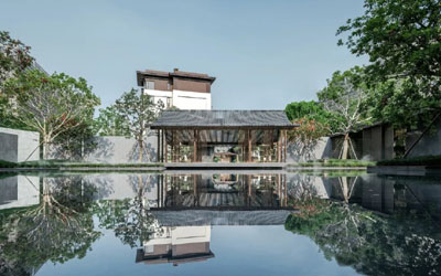 设计承托建筑主题“天河书院”,融入传统文化,以笔墨纸砚为载体,通过新中式手法表现园林景观,体现传统元素与现代风格的融合韵味。并结合其功能性,营造心意世界,人与场所、文化融为一体,宛如一幅徐徐展开的画卷。