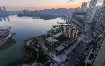 梅溪湖·韦尔斯利酒店位于长沙市梅溪湖国际新城,与扎哈遗作梅溪湖艺术中心遥相呼应。梅溪湖是长沙开发强度最高的片区,滨湖遍布容积率4.0-6.0的超高层住宅与酒店,作为梅溪湖片区最后的一个滨湖酒店,我们提出应该在建筑设计层面,推出一种区别于超高层酒店的新选择,为梅溪湖同质化严重的商务酒店中,提供一种差异化的新体验。