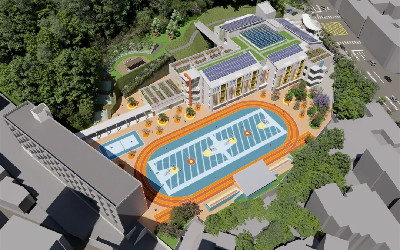 校园设计以「自然共融,学习无界」为理念,让建筑与环境相互对话。入口处不再是生硬的挡土墙,而是以阶梯广场的形式,让地形与景观和谐衔接,使校园如同山势自然展开。校舍依地形微微抬升,错落有致,L形建筑巧妙地串联动线、平台与景观楼梯,消弭了空间的界限,也让学习场域更加立体与灵动。