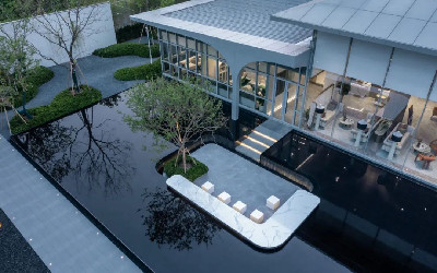花语天境坐标南京市浦口区,位于国家级新区江北新区的主轴之上,南侧六百米为滨江湿地公园,东西侧为未来的商区与住宅区, 坐拥极佳的地段与景观资源。设计团队采用现代极简的设计手法,意图打造光影艺术感的都会森林体验馆,展现江北新区未来的森系生活。