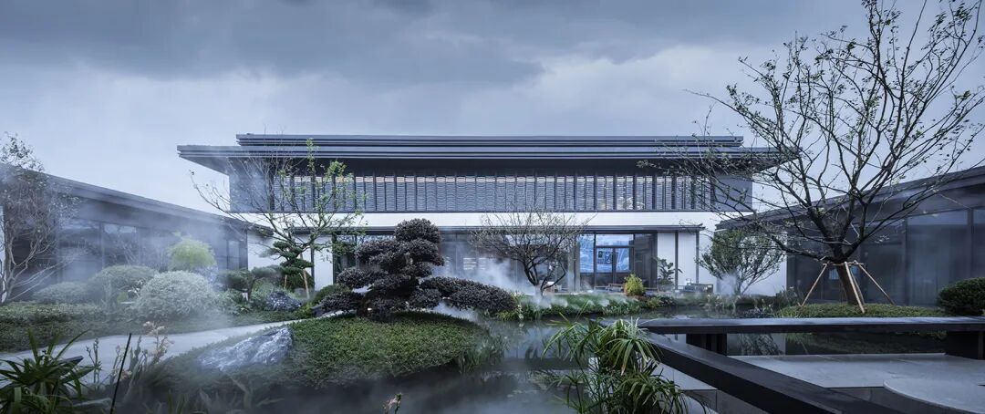 作为水院底景的销售中心,是一座以中式美学为理念打造的现代建筑。它以中式的建筑传承和基本形制为依托,结合现代建筑语言和生态节能的现代建筑材料,成就独特典雅、气质鲜明的新中式造型风格。